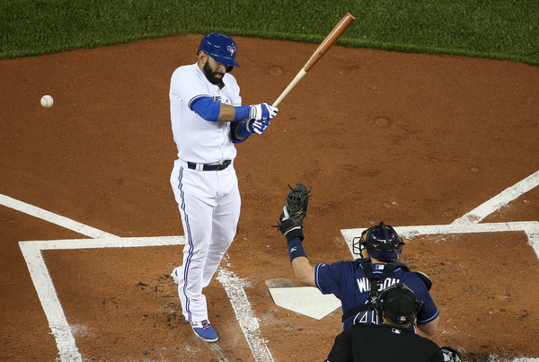 Jose Bautista #19 of the Toronto Blue Jays is hit by pitch in the first inning during MLB game action against the Tampa Bay Rays on April 14, 2015 at Rogers Centre in Toronto, Ontario, Canada.