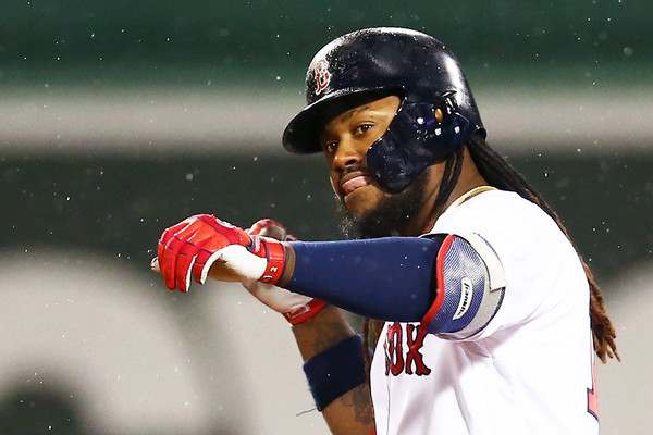 Hanley Ramirez #13 of the Boston Red Sox reacts after hitting a double in the third inning of a game against the Kansas City Royals at Fenway Park on April 30, 2018 in Boston, Massachusetts. (April 29, 2018 – Source: Adam Glanzman/Getty Images North America)