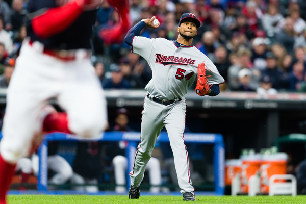 Starting pitcher Ervin Santana #54 of the Minnesota Twins throws out Brandon Guyer #6 of the Cleveland Indians at first on a sacrifice bunt during the fifth inning at Progressive Field on May 12, 2017 in Cleveland, Ohio.