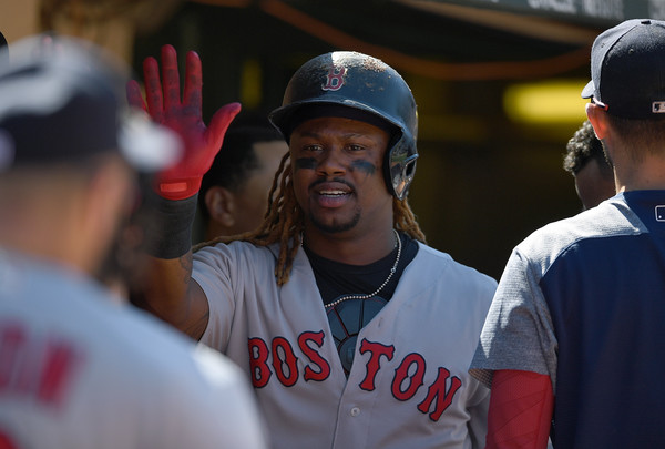 Hanley Ramirez #13 of the Boston Red Sox is congratulated by teammates after scoring against the Oakland Athletics in the top of the ninth inning at Oakland Alameda Coliseum on May 21, 2017 in Oakland, California. The Red Sox won the game 12-3.(May 20, 2017 – Source: Thearon W. Henderson/Getty Images North America)