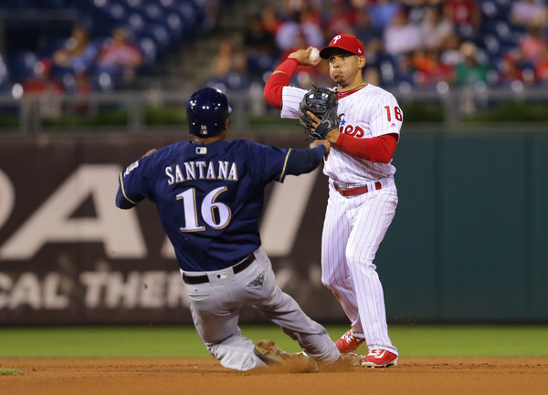Cesar Hernandez #16 of the Philadelphia Phillies forces out Domingo Santana #16 of the Milwaukee Brewers at second base as he turns a double-play in the seventh inning during a game at Citizens Bank Park on July 22, 2017 in Philadelphia, Pennsylvania. The Brewers won 9-8. (July 21, 2017 – Source: Hunter Martin/Getty Images North America)