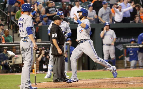 Jose Bautista #19 of the Toronto Blue Jays celebrates with teammate Michael Saunders #21 after scoring a run in the third inning against the Baltimore Orioles at Oriole Park at Camden Yards on April 19, 2016 in Baltimore, Maryland.