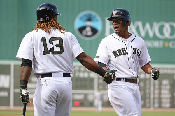 Xander Bogaerts #2 high fives Hanley Ramirez #13 of the Boston Red Sox after scoring in the first inning of a game against the Seattle Mariners at Fenway Park on May 27, 2017 in Boston, Massachusetts. (May 26, 2017 – Source: Adam Glanzman/Getty Images North America)