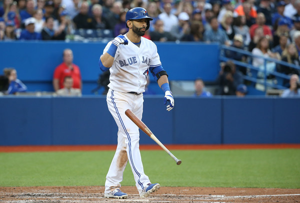 Jose Bautista #19 of the Toronto Blue Jays reacts after drawing an RBI walk with the bases loaded in the second inning during MLB game action against the Baltimore Orioles on June 19, 2015 at Rogers Centre in Toronto, Ontario, Canada.