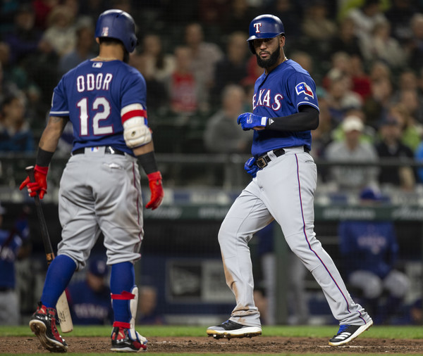 Nomar Mazara #30 of the Texas Rangers crosses home plate in front of Rougned Odor #12 of the Texas Rangers to score a run on a wild pitch by relief pitcher James Pazos #47 of the Seattle Mariners during the sixth inning of a game at Safeco Field on May 29, 2018 in Seattle, Washington. (May 28, 2018 – Source: Stephen Brashear/Getty Images North America)