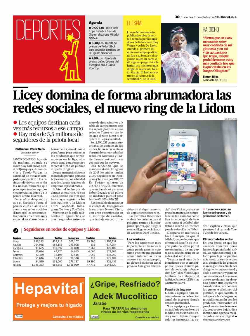 “Para los equipos es muy importante, en las redes la gente puede generar consumo y se integra, pueden opinar, interactuar. Es un acceso a un canal propio, no dependen de un canal privado. Una gran diferencia”, dice Vicioso, cuya empresa ha manejado competencias tan variadas como liga intercolegial de básquet hasta el voleibol distrital o diseñó uniformes para la selección de fútbol.