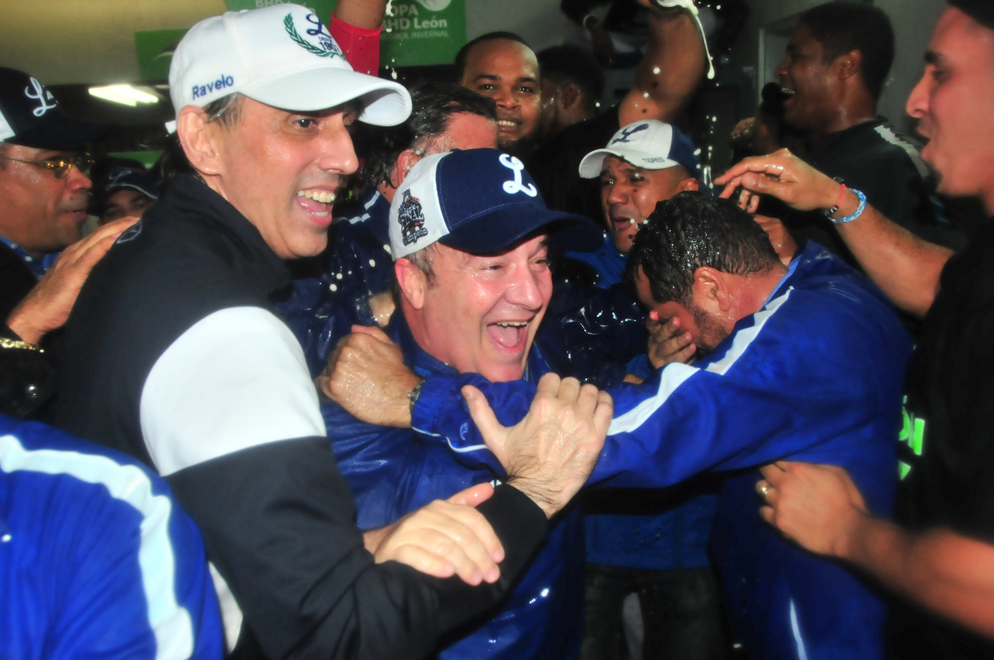 Junior Noboa, Gerente General, celebra junto a Miguel Angel Fernández, presidente del equipo y Ricardo Ravelo, vicepresidente, en el club house de visitantes en la madrugada del domingo luego de ganar el campeonato del 2016-17 en el Estadio Cibao (Isaac Calvo)