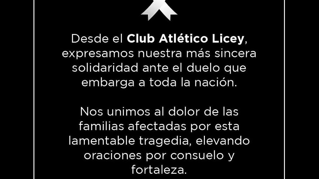 «Desde el club Atlético Licey, expresamos nuestra más sincera solidaridad ante el duelo que embarga a toda la nación. Nos unimos al dolor de las familias afectadas por esta lamentable tragedia, elevando oraciones por consuelo y fortaleza», expresa mediante un comunicado el equipo capitaleño.