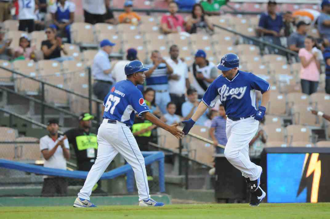 El estadounidense Chris Parmelee, es saludado por el coach Luis Natera luego de conectar cuadrangular en la tercera entrada en juego del sábado en la tarde en el Estadio Quisqueya de Santo Domingo (Isaac Calvo/Licey.com)