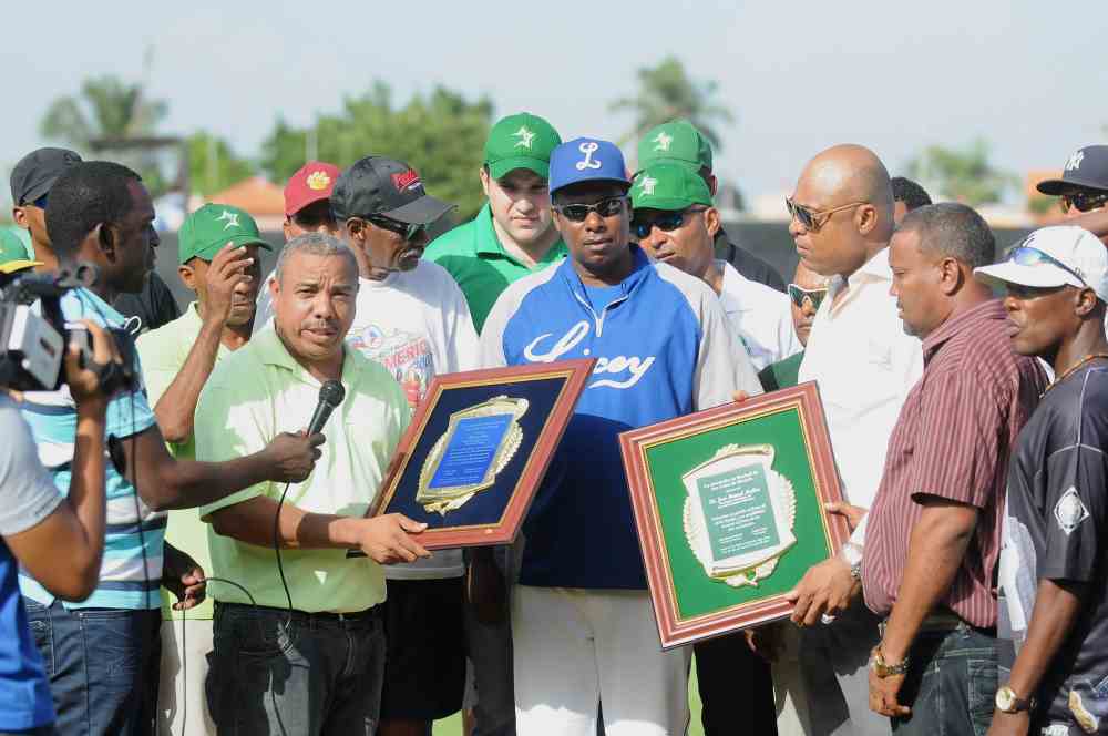 SAN PEDRO DE MACORIS,-El mánager José Offerman en representación de Manny Acta, Gerente General del Licey, recibe las placas de reconocimiento que le entregó José Canó, de la Fundación Robinzon Canó, a quien era dedicado el partido.