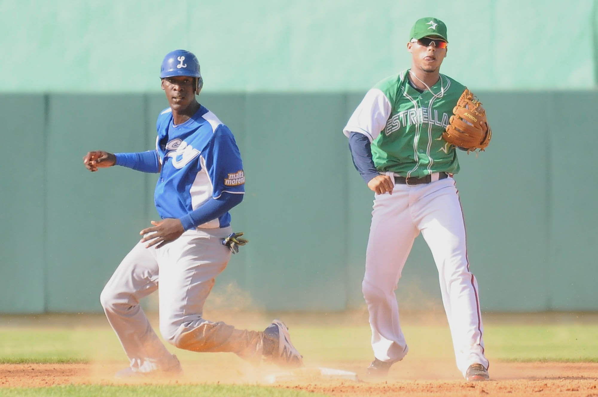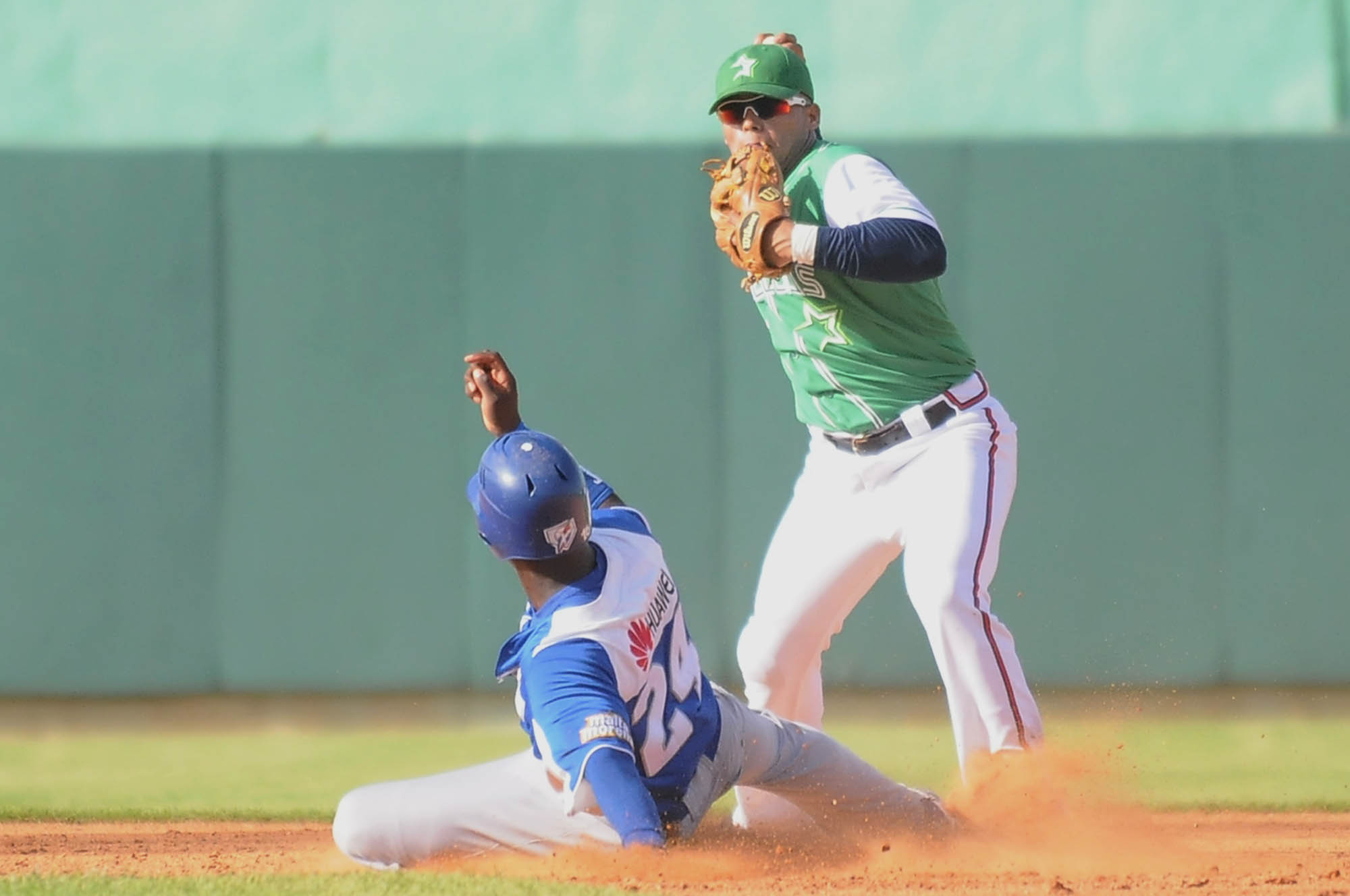 SAN PEDRO DE MACORIS.-El intermedista Gustavo Núñez, de las Estrellas, pone fuera a Gustavo Pierre, del Licey, con batazo de D’Angelo Jiménez quien bateó para doble matanza en la sexta entrada del juego de pretemporada del sábado que ganaron las Estrellas 6-1 al Licey en el Estadio Tetélo Vargas (Foto:Raúl Calvo).
