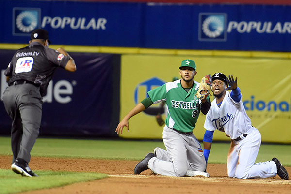 El corredor Julio Borbón, de los Tigres, pide la opinión del umpire de segunda Félix Tejeda, mientras canta el out de la jugada en el que Fernando Tatis III lo toca y lo pone fuer en la segunda base en el juego del viernes por la noche que las Estrellas Orientales vencieron 4-1 a los Tigres del Licey (Isaac Calvl/Prensa Licey).