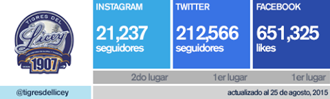 En Twitter, los máximos ganadores de títulos de la pelota vernácula (21 desde 1951 y 23 en total), están al frente con 212,566 asiduos, mediante @tigresdellicey. Y en Instagram se sitúa segundo con 21,237, con la cuenta TigresDelLicey.