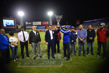 El alcalde del Distrito Nacional, David Collado, cuya gestión patrocinó la batalla librada por azules y rojos, de ordinario denominada como “City Champ”, puso la gran copa en manos del presidente del Club Atlético Licey, ingeniero Jaime Alsina De Castro, quien fue acompañado en el terreno por el vicepresidente Tancredo Aybar Torres, el tesorero Federico González y el gerente general de los campepones nacionales Junior Noboa.
