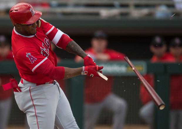 The Angels’ Rymer Liriano breaks his bat on a single against the Oakland Athletics during their Cactus League opener at Hohokam Stadium in Mesa on Friday, Feb. 23, 2018. (Photo by Kevin Sullivan/Orange County Register/SCNG)