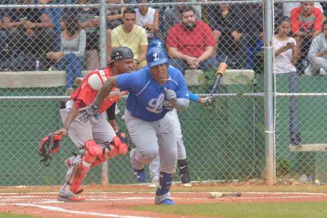 SANTO DOMINGO,-Yermín Mercedes corre a la inicial luego de batear rodado por primera. Wilkin Castillo detrás marcando la jugada (Isaac Calvo/Licey.com)