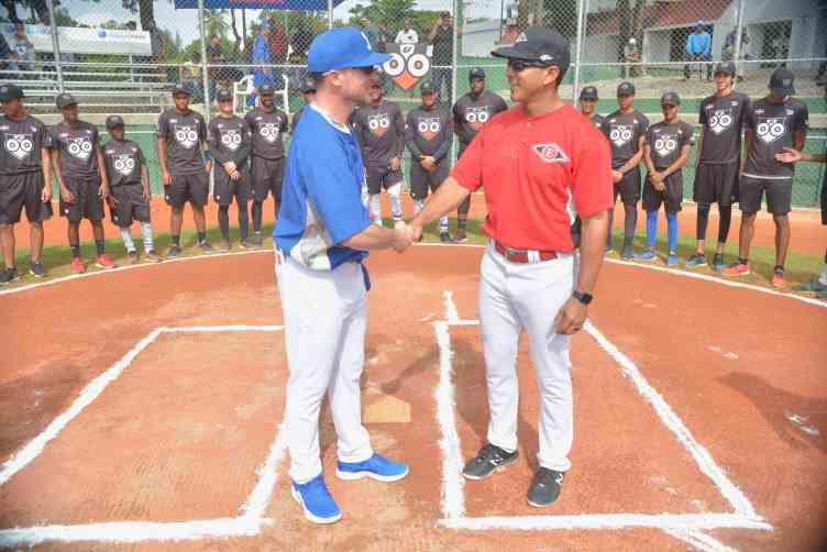 SANTO DOMINGO.-El mánager Robbie Hammock, del Licey, saluda antes del juego de pretemporada al dirigente Luis Rojas, del Escogido (Isaac Calvo/Licey.com)