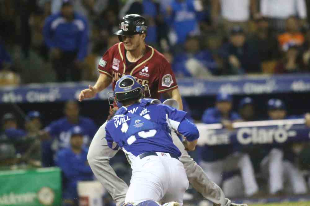 Loogan Moore, de los Tigres, pone fuera en el plato a Joe Krizan, de los Gigantes, en el juego del jueves por la noche del round robin dominicano (Isacc Calvo)