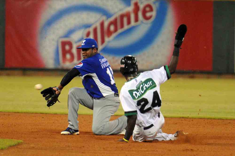 Anderson Hernández, del Licey, espera la pelota para tratar de poner out al corredor Orlando Carlixle, de las Estrellas en la intermedia.
