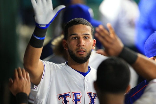 Nomar Mazara #30 of the Texas Rangers is congratulated for scoring in the seventh inning on a sacrifice fly hit by Odor to tie the game against the Houston Astros at Globe Life Park in Arlington on June 6, 2016 in Arlington, Texas.