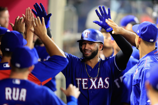 Nomar Mazara #30 scores on a single hit by Robinson Chirinos #61 of the Texas Rangers and is congratulated in the dugout as Martin Maldonado #12 of the Los Angeles during the tenth inning of a game against the Los Angeles Angels of Anaheim at Angel Stadium of Anaheim on August 23, 2017 in Anaheim, California.