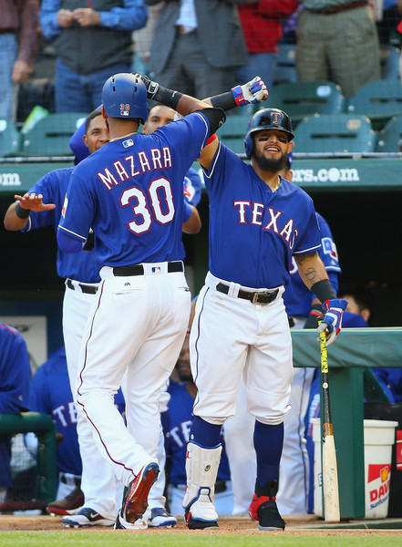 Rougned Odor #12 of the Texas Rangers congratulates Nomar Mazara #30 for hitting a two run home run in the first inning against the Cleveland Indians at Globe Life Park in Arlington on April 5, 2017 in Arlington, Texas.