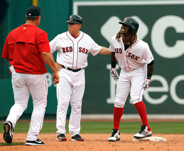 Hanley Ramirez #13 of the Boston Red Sox receives attention after an injury at second base against the Tampa Bay Rays in the seventh inning against at Fenway Park on April 16, 2017 in Boston, Massachusetts.