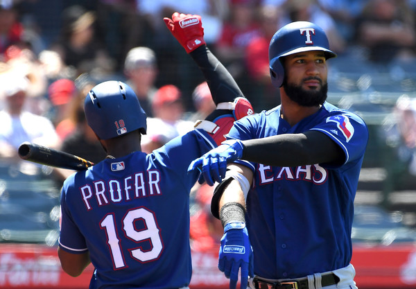 Nomar Mazara #30 is congratulated by Jurickson Profar #19 of the Texas Rangers after hitting a solo home run in the eighth inning of the game against the Los Angeles Angels of Anaheim at Angel Stadium on June 3, 2018 in Anaheim, California.