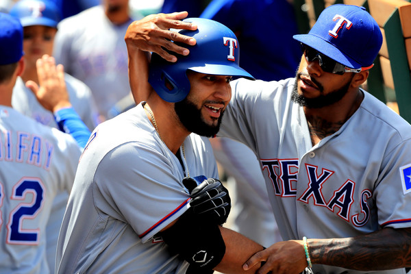Delino DeShields #3 congratulates Nomar Mazara #30 of the Texas Rangers after hitting a two-run homerun during the third inning of a game against the Los Angeles Angels of Anaheim at Angel Stadium of Anaheim on April 13, 2017 in Anaheim, California.