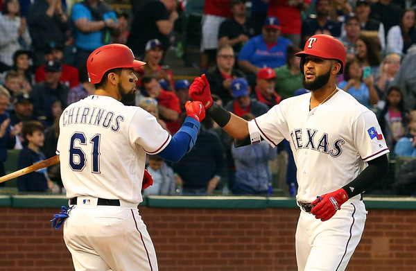 Robinson Chirinos #61 of the Texas Rangers fist bumps Nomar Mazara #30 of the Texas Rangers after a solo home run in the second inning against the Houston Astros at Globe Life Park in Arlington on March 30, 2018 in Arlington, Texas.