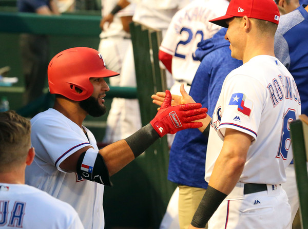 Nomar Mazara #30 of the Texas Rangers is greeted in the dugout by Drew Robinson #18 of the Texas Rangers after a solo home run in the second inning of a baseball game against the Houston Astros at Globe Life Park in Arlington on March 30, 2018 in Arlington, Texas.