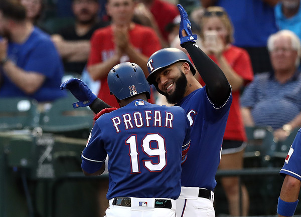 Jurickson Profar #19 of the Texas Rangers celebrates a three-run homerun with Nomar Mazara #30 against the New York Yankees in the first inning at Globe Life Park in Arlington on May 22, 2018 in Arlington, Texas.