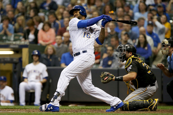 Domingo Santana #16 of the Milwaukee Brewers hits a home run in the sixth inning against the Pittsburgh Pirates at Miller Park on May 4, 2018 in Milwaukee, Wisconsin.(May 3, 2018 – Source: Dylan Buell/Getty Images North America)