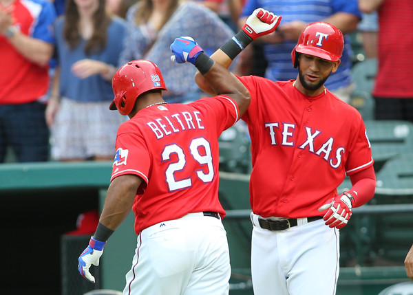Adrian Beltre #29 of the Texas Rangers is congratulated by Nomar Mazara #30 after hitting a three run home run in the first inning at Globe Life Park in Arlington on June 3, 2016 in Arlington, Texas.