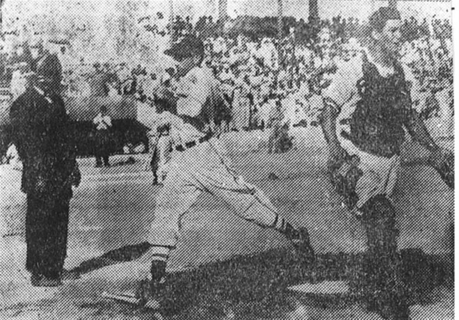 El lanzador cibaeño, oriundo de Bonao, anota en carrera, la decisiva, en el juego ganado por el Licey al Escogido 3 x 1 carreras. Vargas pitcheó y bateó para obtener el triunfo (1952). Vicente Scarpatte (E) es el receptor.