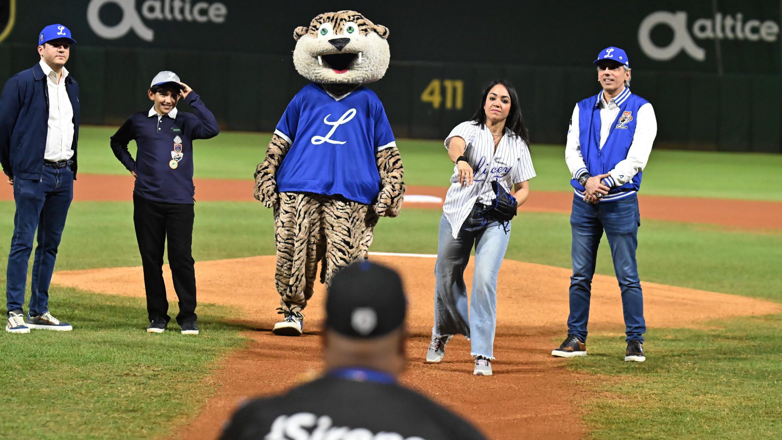 Raful fue acompañada por el presidente del club Atlético Licey, Ricardo Ravelo y por Anderson Hernández, coach de infield y jugador histórico de los azules, quien sirvió como receptor de honor.