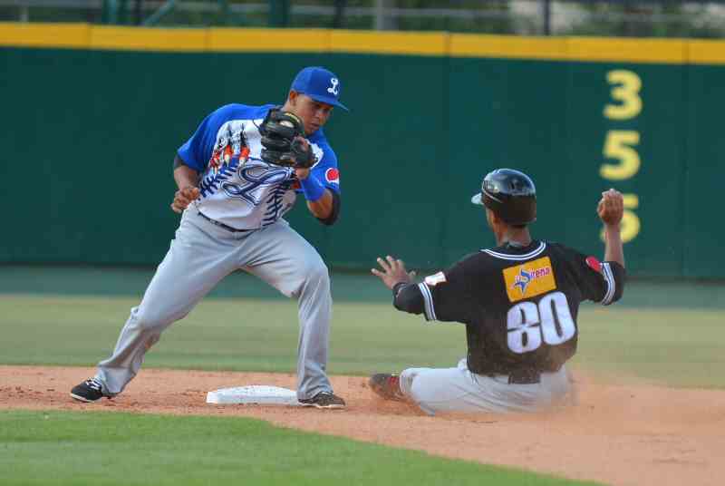 SAN FRANCISCO DE MACORIS.-El mocano Marco Hernández, del Licey, toca para poner fuera en la intermedia a Richard Ureña, de los Gigantes, en la segunda entrada del juego de pretemporada en el Estadio Julián Javier.