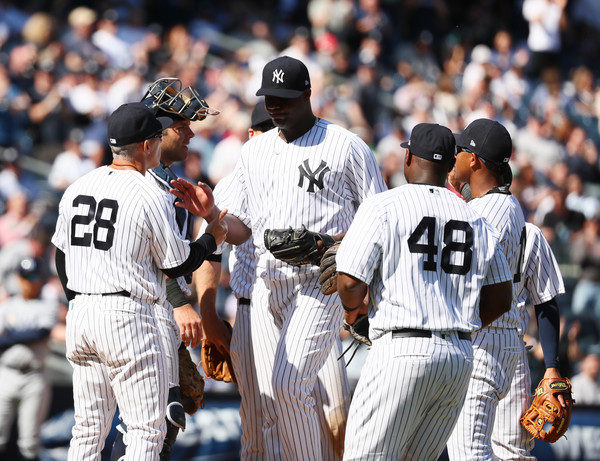 Michael Pineda #35 of the New York Yankees leaves the game in the eigth inning against the Tampa Bay Rays during the New York Yankees home Opening game at Yankee Stadium on April 10, 2017 in New York City.