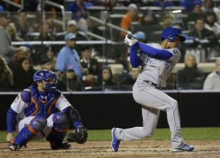 El dominicano Raúl Adalberto Mondesí, de los Reales de Kansas City, hace el swing en el tercer juego de la Serie Mundial, el viernes 30 de octubre de 2015 (AP Foto/David J. Phillip)