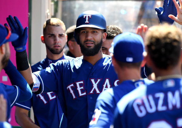 Nomar Mazara #30 is congratulated by Jurickson Profar #19 of the Texas Rangers after hitting a solo home run in the eighth inning of the game against the Los Angeles Angels of Anaheim at Angel Stadium on June 3, 2018 in Anaheim, California.