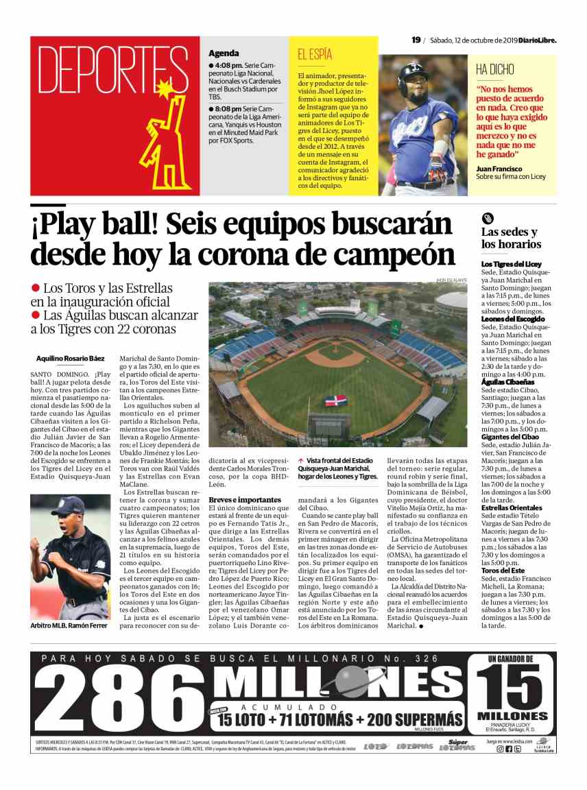 • La Alcaldía del Distrito Nacional renovó el acuerdo de colaboración que sostiene hace 3 años con la Liga de Béisbol Profesional de la República Dominicana (Lidom) como un aporte para el acondicionamiento de las instalaciones del Estadio Quisqueya Juan Marichal de cara al inicio de la temporada invernal de béisbol 2019-2020.
