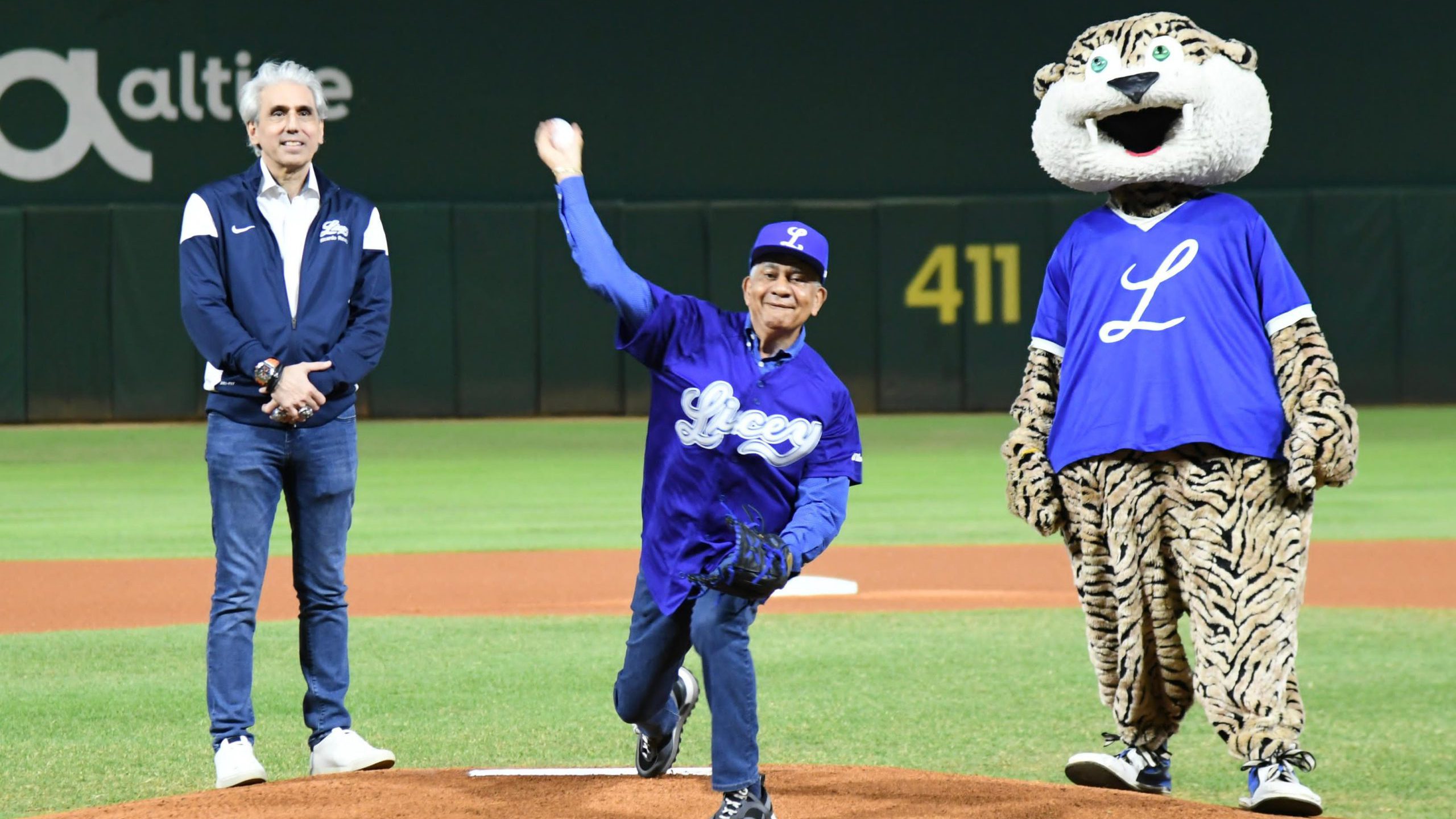 De los Santos fue acompañado en el montículo por Ricardo Ravelo, presidente del Club Atlético Licey y por el lanzador, Adonis Medina, quién sirvió como receptor de honor.