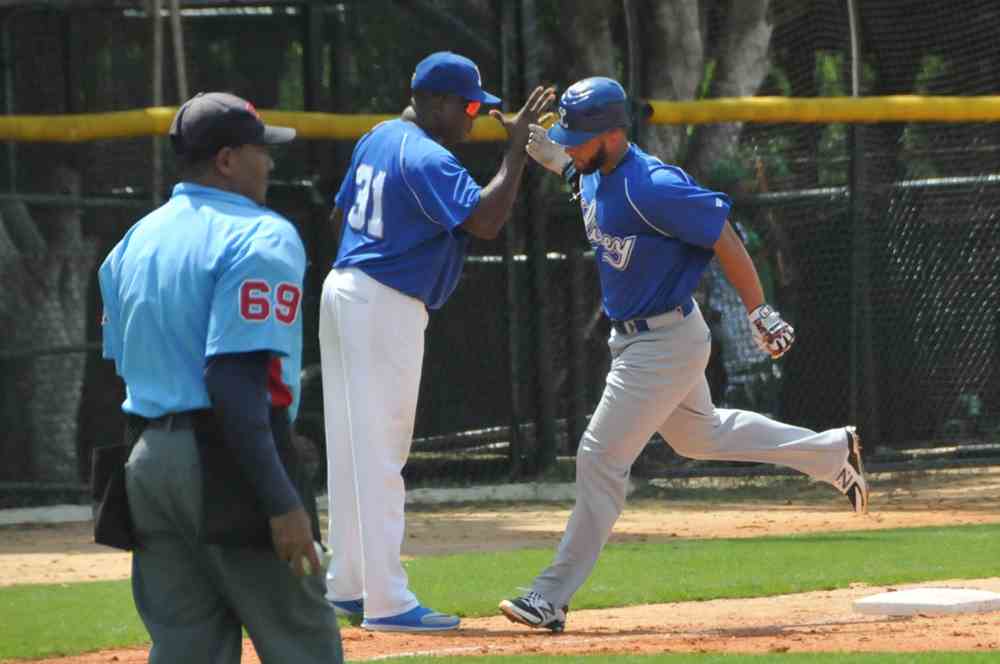 BASEBALL CITY, Boca Chica,-José Marmolejos, del Licey es saludado por el coach Héctor de la Cruz al pasar por la tecera base luego de conectar cuadrangular en la quinta entrada ante Edison Reyes, de las Estrellas del juego de pretemporada que Licey ganó 6-5 a las Estrellas en la Academia de Cincinnati (Foto:Isaac Calvo, LICEY.COM)