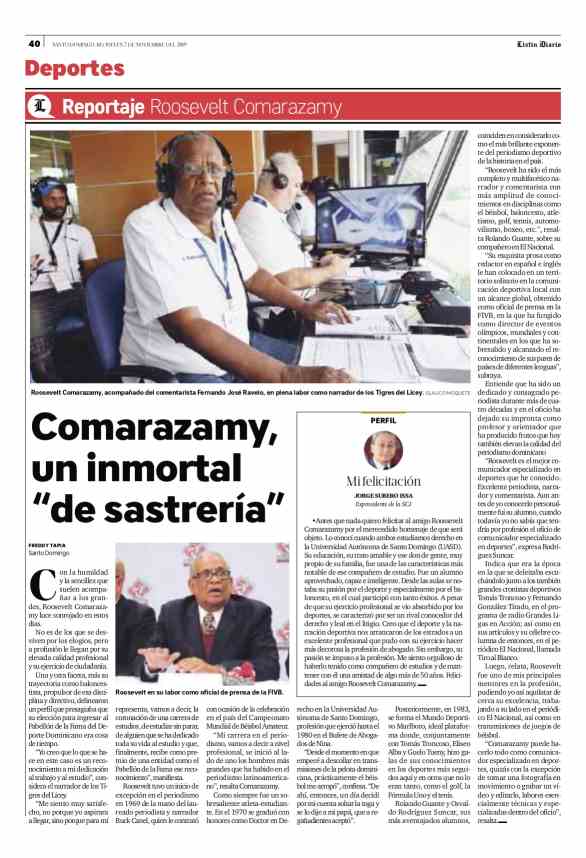 Antes que nada quiero felicitar al amigo Roossevelt Comarazamy por el merecedido homenaje de que será objeto. Lo conocí cuando ambos estudiamos derecho en la Universidad Autónoma de Santo Domingo (UASD). Su educación, su trato amable y ese don de gente, muy propio de su familia, fue una de las características más notable de ese compañero de estudio. Fue un alumno aprovechado, capaz e inteligente. Desde las aulas se notaba su pasión por el deporte y especialmente por el baloncesto, en el cual participó con tanto éxitos. A pesar de que su ejercicio profesional se vio absorbido por los deportes, se caracterizó por ser un rival conocedor del derecho y leal en el litigio. Creo que el deporte y la narración deportiva nos arrancaron de los estrados a un excelente profesional que pudo con su ejercicio hacer más decorosa la profesión de abogado. Sin embargo, su pasión se impuso a la profesión. Me siento orgulloso de haberlo tenido como compañero de estudios y de mantener con él una amistad de algo más de 50 años. Felicidades al amigo Roosevelt Comarazamy.