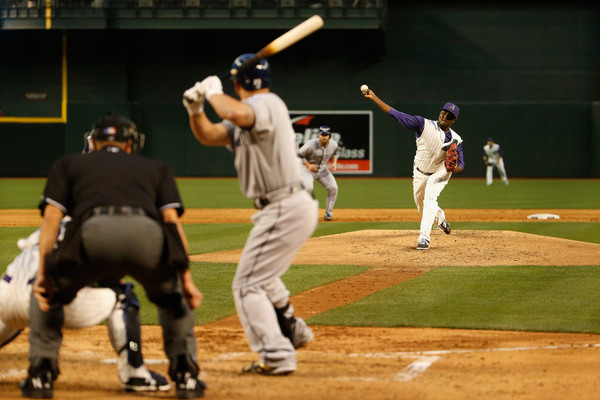 Starting pitcher Rubby De La Rosa #12 of the Arizona Diamondbacks pitches against Yonder Alonso #23 of the San Diego Padres during the second inning of the MLB game at Chase Field on May 7, 2015 in Phoenix, Arizona.