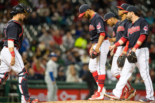 Starting pitcher Danny Salazar #31 of the Cleveland Indians is congratulated by his teammates as he leaves the game during the eighth inning against the Kansas City Royals at Progressive Field on May 6, 2016 in Cleveland, Ohio.