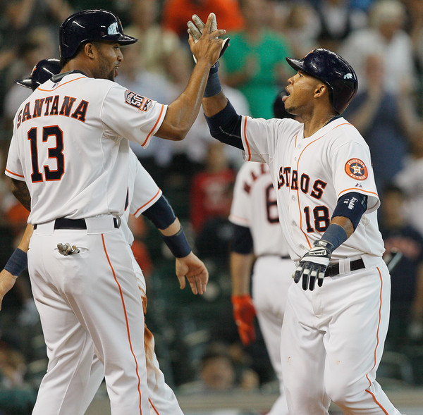Luis Valbuena #18 of the Houston Astros receives a high five from Domingo Santana #13 after hitting a home run in the third inning against the Colorado Rockies at Minute Maid Park on June 16, 2015 in Houston, Texas.