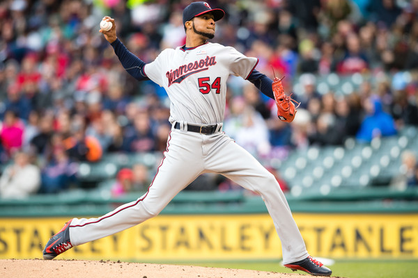 Starting pitcher Ervin Santana #54 of the Minnesota Twins pitches during the first inning against the Cleveland Indians at Progressive Field on May 14, 2016 in Cleveland, Ohio.