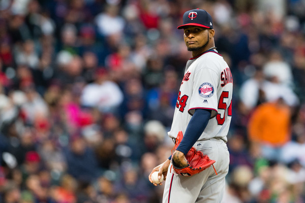 Starting pitcher Ervin Santana #54 of the Minnesota Twins checks first after giving up a walk during the fourth inning against the Cleveland Indians at Progressive Field on May 12, 2017 in Cleveland, Ohio.(May 11, 2017 – Source: Jason Miller/Getty Images North America).