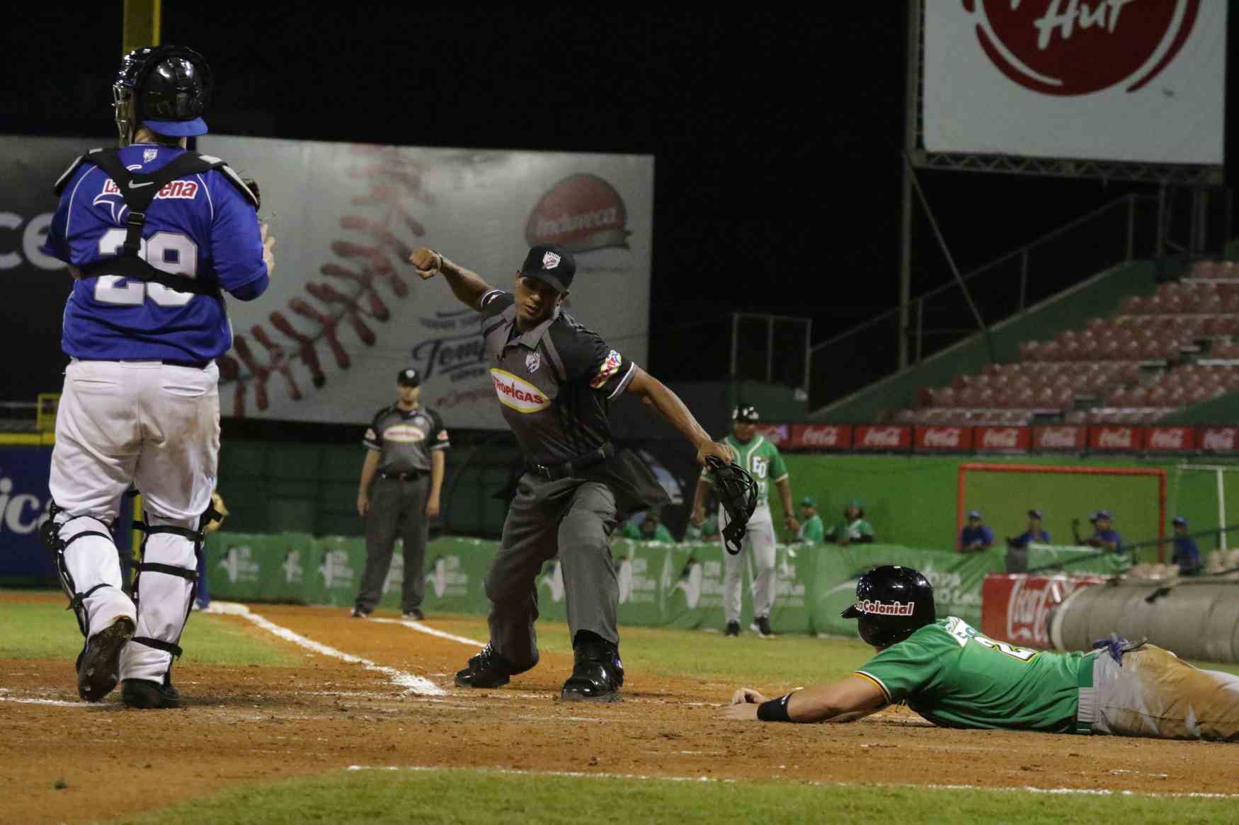 SANTO DOMINGO,-El umpire dominicano Hardlen Acosta, de home plate, canta out al estadounidense Frank Schwindell, de las Estrellas, por el receptor boricua Roberto Pérez con un disparo de Yamaico Navarro desde el jardín izquierdo en la cuarta entrada (Isaac Calvo/Licey.com)